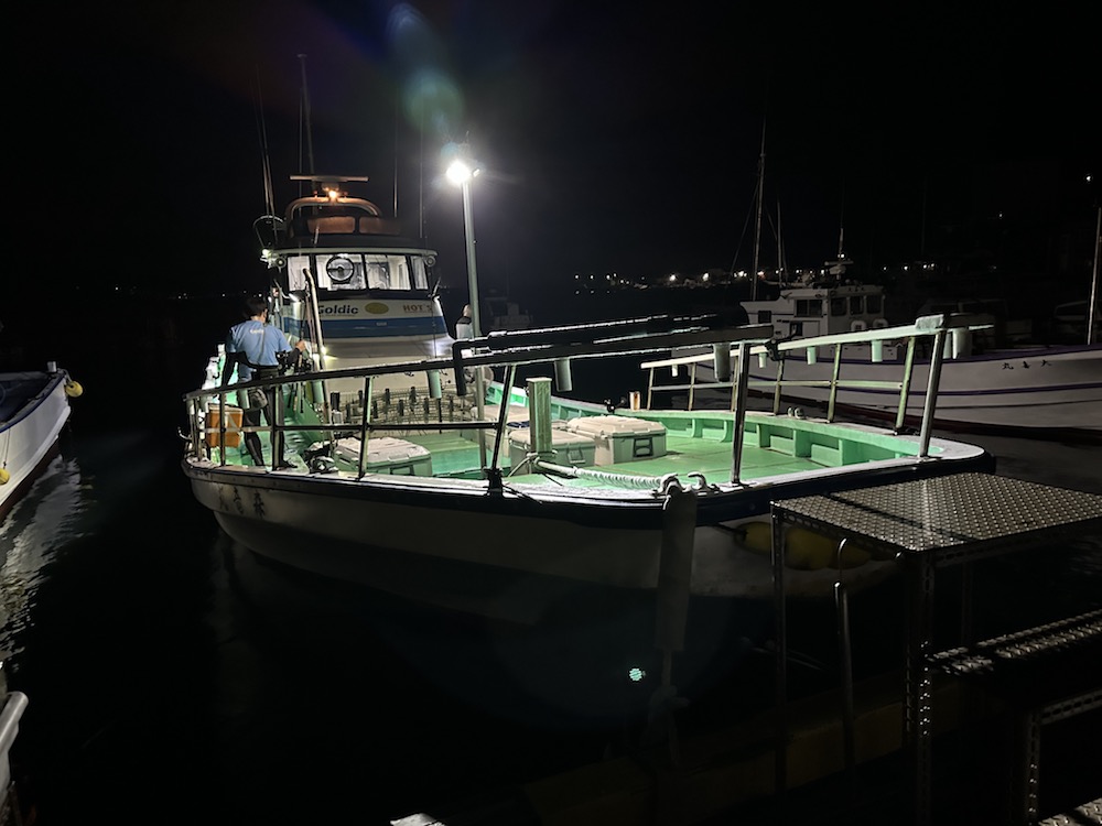 出船準備をし、釣り座を決めて真っ暗な空の下で乗船。3時30分。それからはエアコンの効いたキャビンで再び2時間半爆睡し伊豆南沖に到着したのでした。
