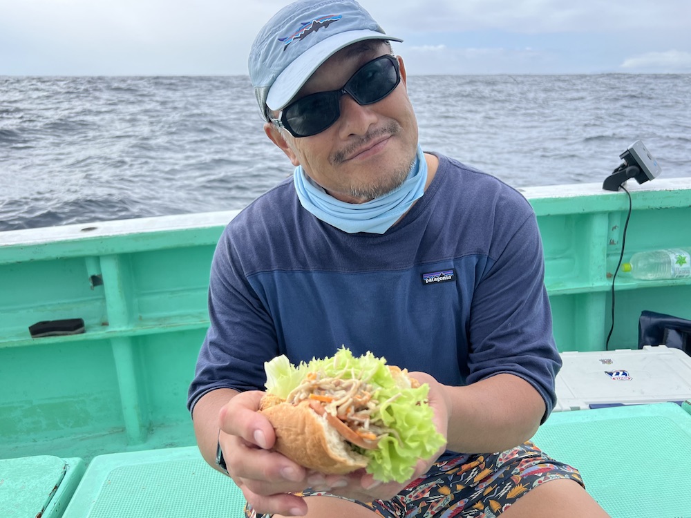 さあ、潮も落ち着き朝食タイム。私は前日に準備しておいたフランスパンを半分に割り、そこへレタスやハム、スライスチーズにポテトサラダなどを挟んでいきます。