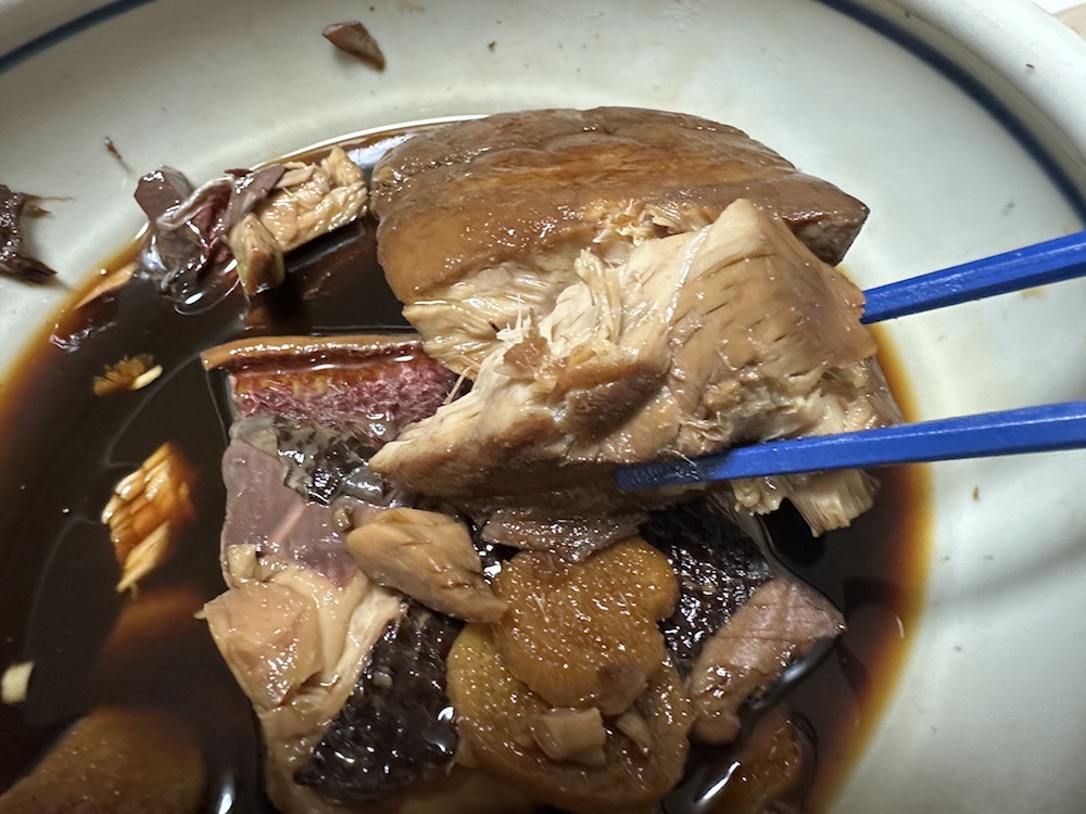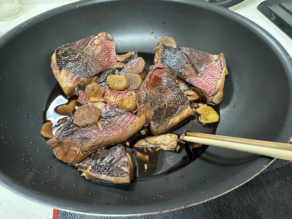 今回伊豆で釣れたハチビキは煮付けにしてみました。白身魚の煮付けと同じ味付けで生姜も刻み甘辛く煮たて調理。さあ、実食です。