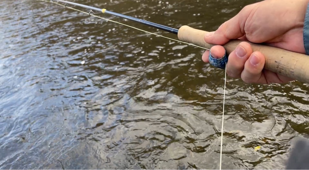 切ったロッドのティップを再び自分の前位置まで持って来る事で重い大きなフライは私の前にある。