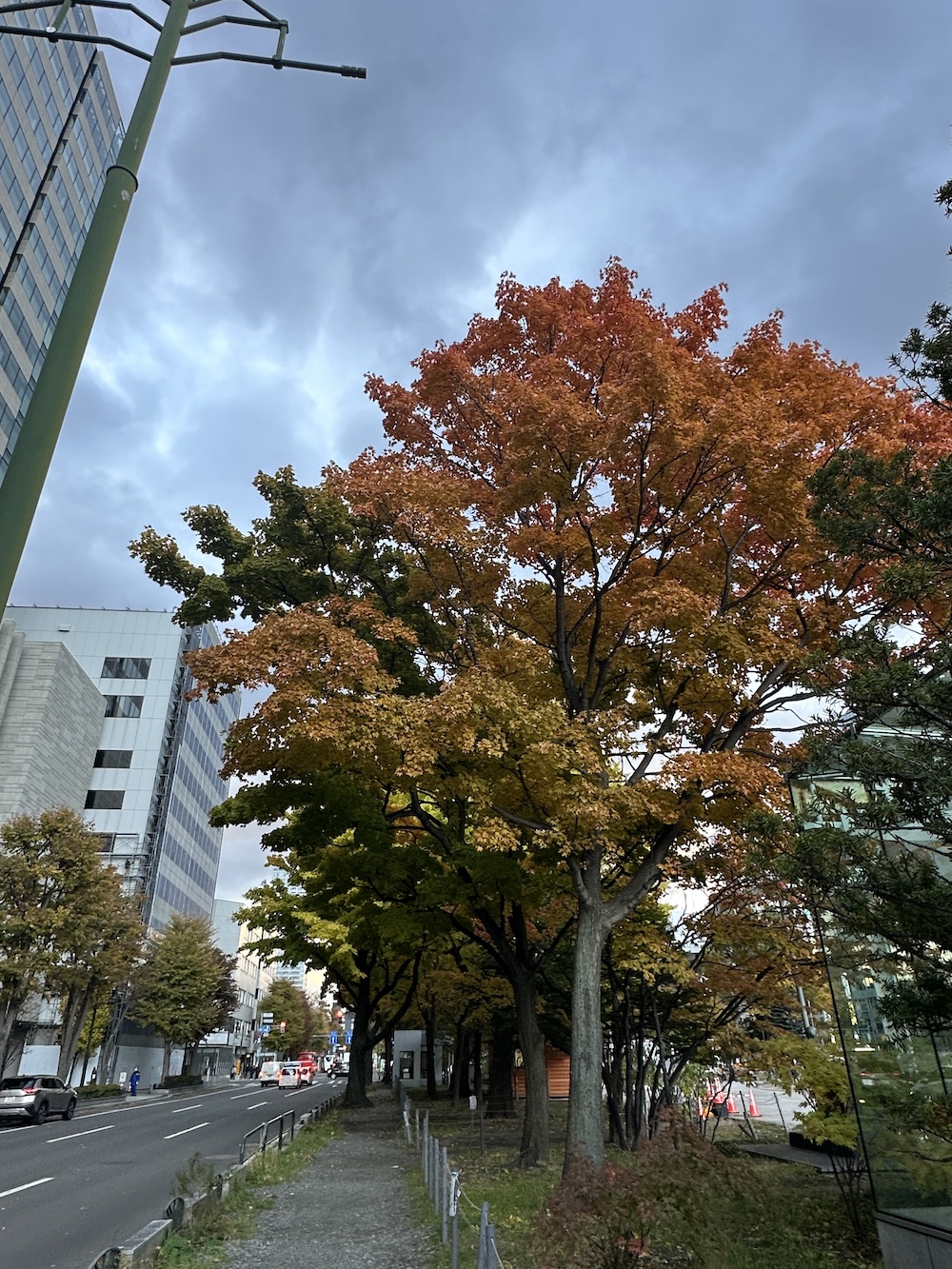 大通り公園の街路樹が紅葉に染まっていた。黄色、朱色、紅色に茶色。様々な色が重なる樹木が時に吹く風になびき、もうすぐ近くまで来ている冬も感じながら歩いたのでした。