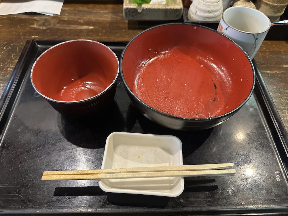 すぐにうなぎ丼定食は運ばれてきました。味噌汁、おしんこ付きです。私は山椒粉をふり、黙々と実食。甘醤油のタレがたっぷりご飯に掛かっており、まずはご飯を口にかき込む。