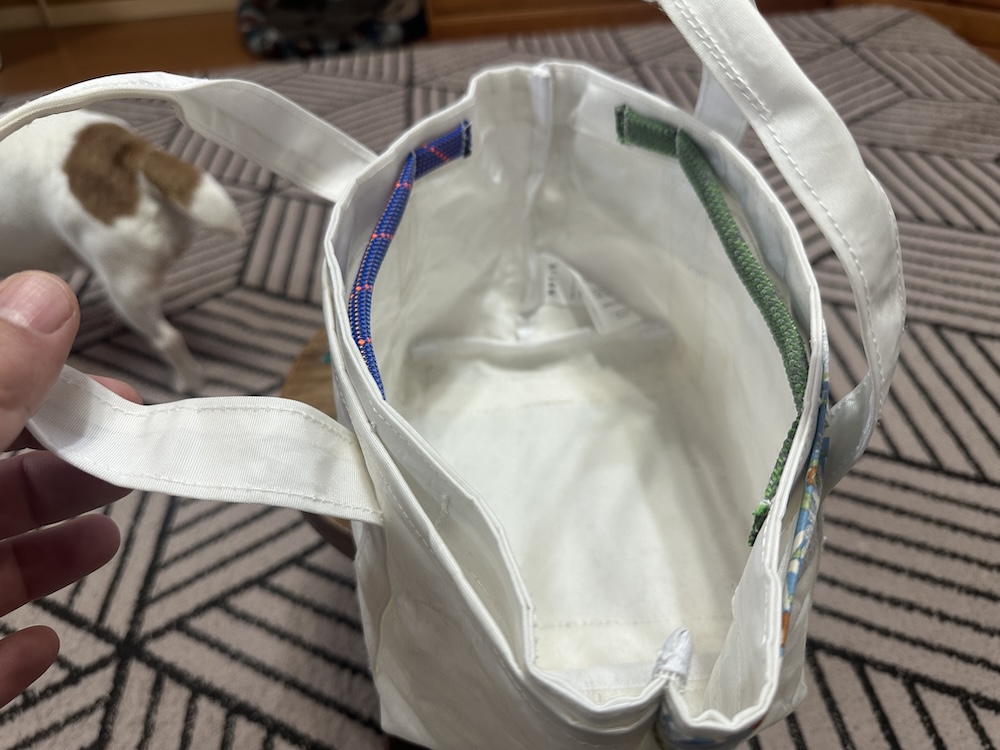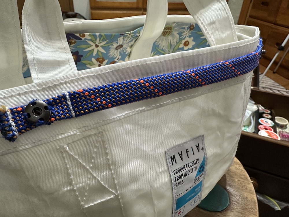 女房からしばらく〈マフィア・ミニ・トート〉を預かり、考えてみる。トートの生地はかなりしっかりしていて硬い。深さが無い。どうしようかと考えた結果、内側に張られているロープ生地にホックを縫い付けて簡単な『止め』を付けてやる事にした。