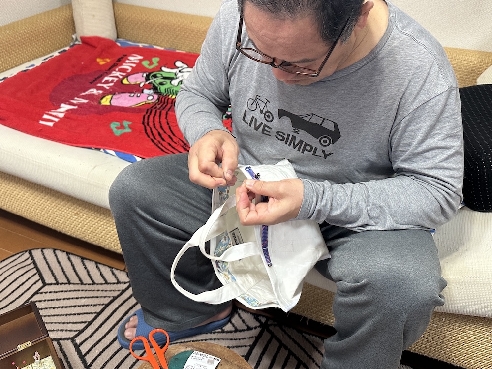 慌ててティッシュで拭き取り、カットバンで指先を保護。白くキレイなトートが血で染まってしまうのはアカン…。しばらく止血し再び縫い始める。
