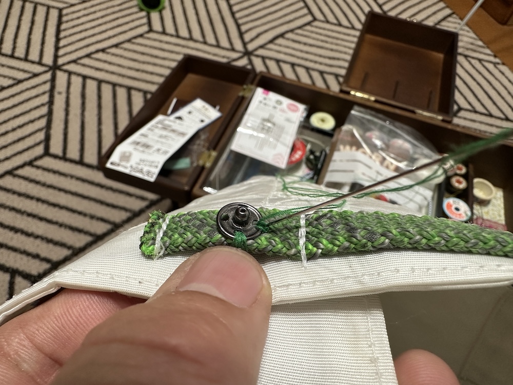 先に書いた通り、ロープ生地が豪快に硬いので、針のひと通しだけでも大変。チカラを入れると、縫い針が簡単に折れてしまう…。