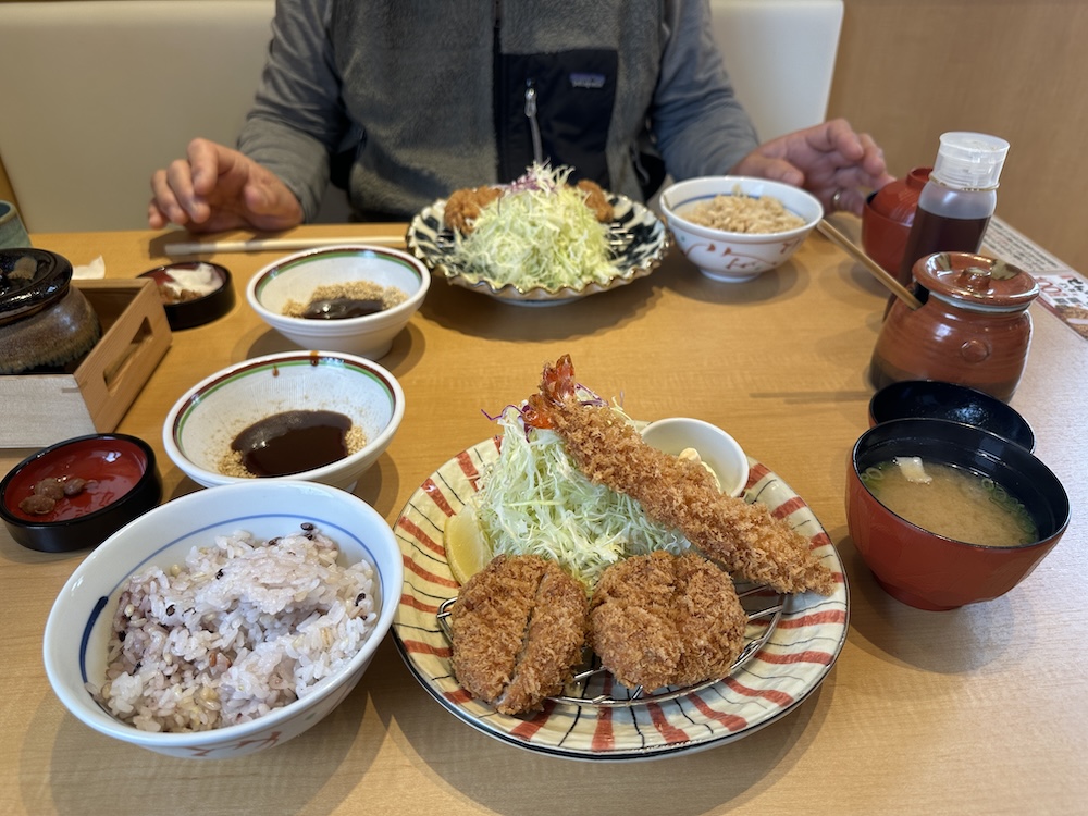 私は炊き込みご飯とナメコ味噌汁、そして「ロース150g」と何気なく言ってしまった。女房は特大エビがメインの「レディース定食」。