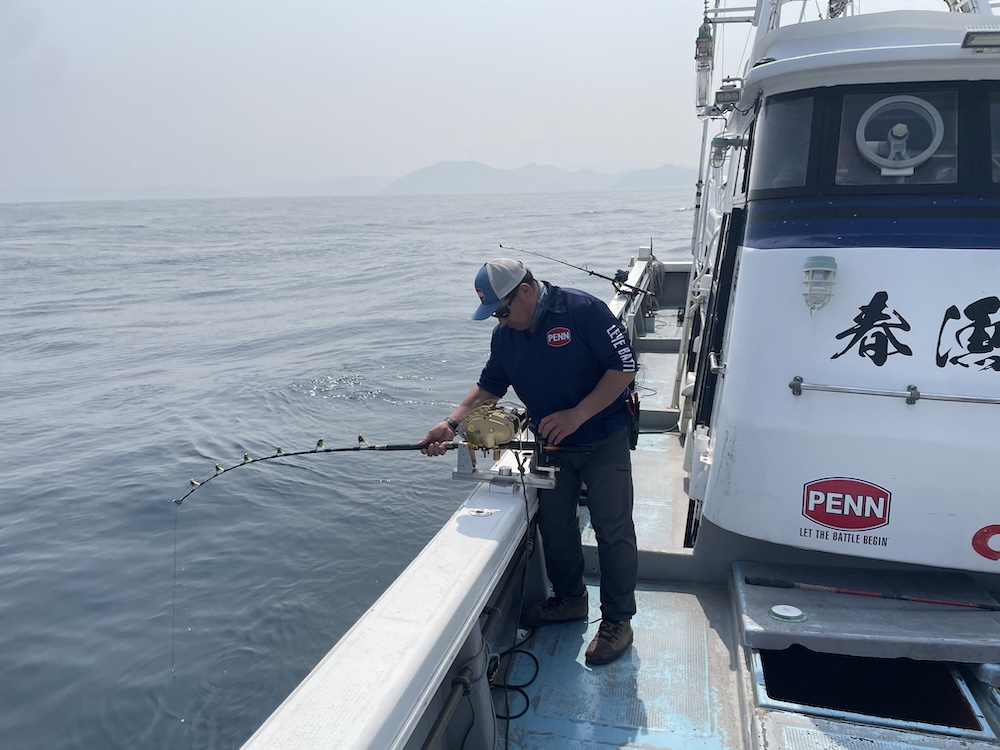 電動仕掛けでサバを泳がせて、まずはブリ、ヒラマサを狙う。リールボタンをポチりとやり、ボトムが取れたら少し棚取りをし待つ。