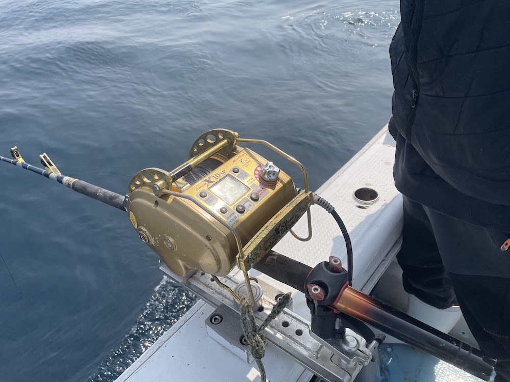 船長や奥さん、若船長は電動。私と釣り仲間のSAMさんは手巻き。140m落としたらほぼ喰いがあるので再び海面まで巻き上げなくてはならない。