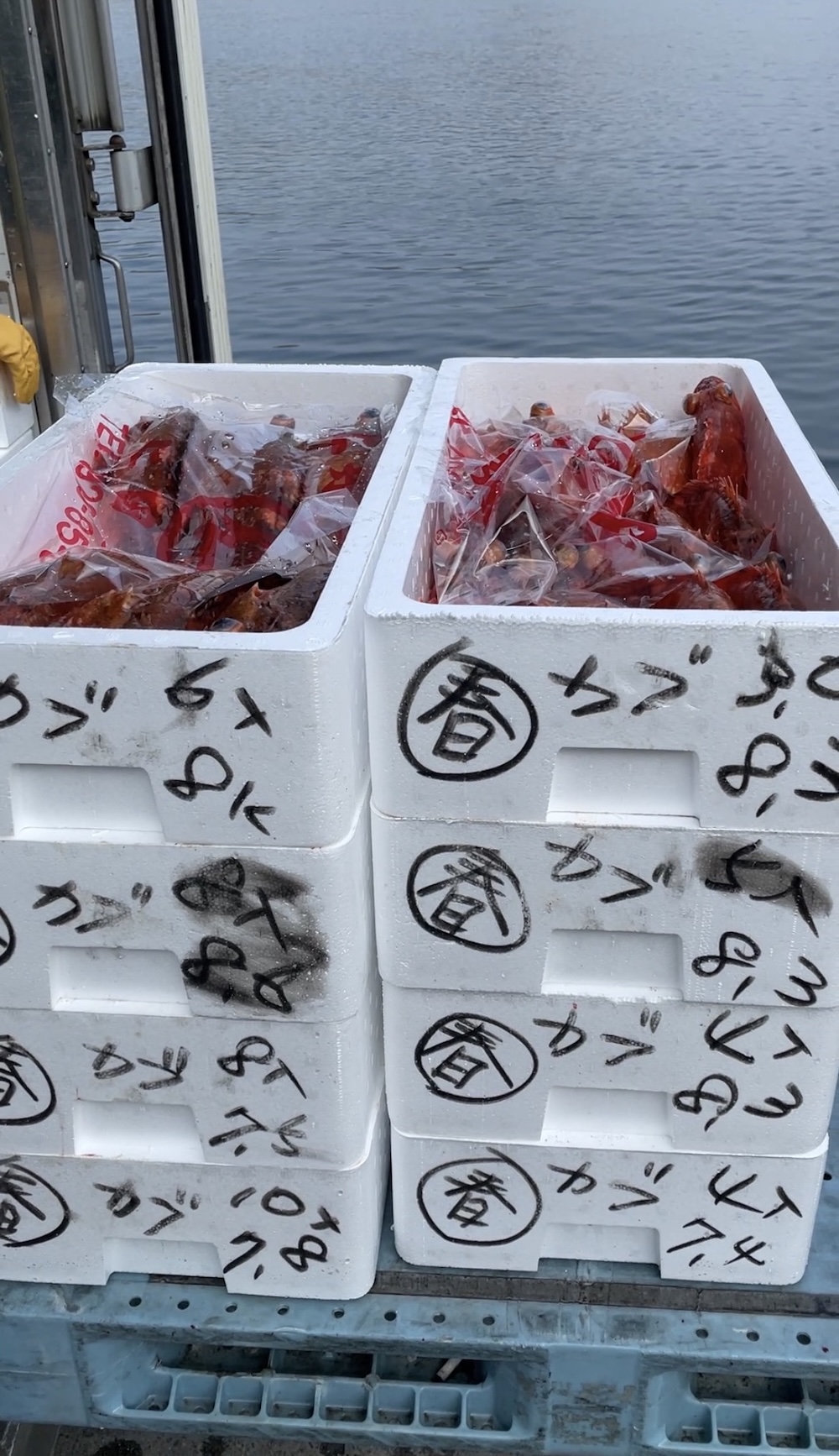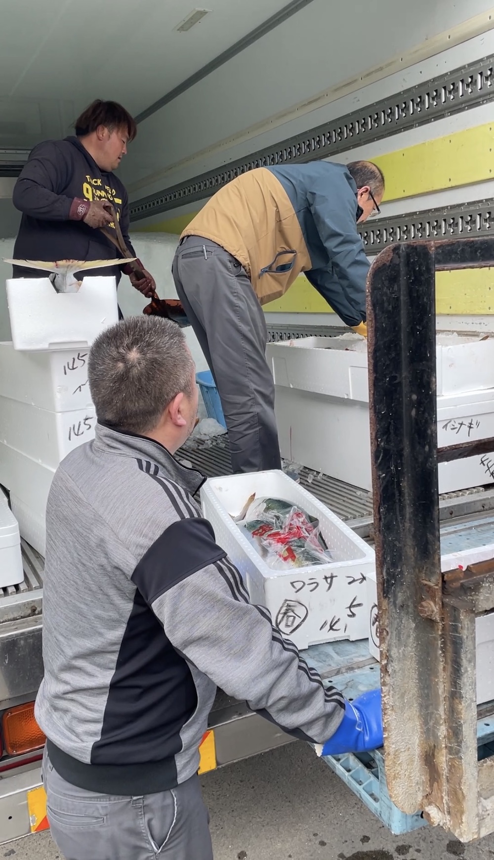 発泡箱に「マル春」と記され冷蔵車に次々と積まれて全てが完了。これで漁業は終了となったのでした。