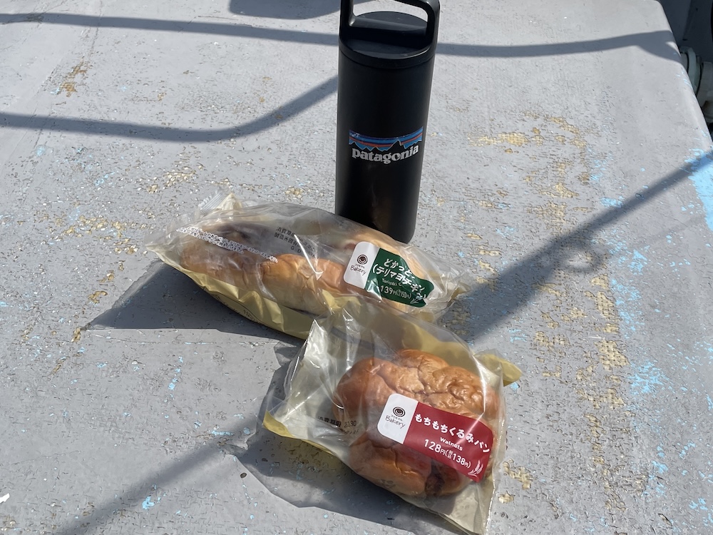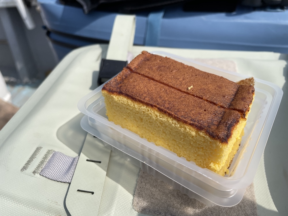 やっぱり変わり映えのないメニューでしたが、とりあえず「お腹を満たす」ことを優先し、頂きました。PM12:30 《東沖海上》お昼ご飯は、コンビニで購入してあったカステラ。そして「東横インパン」にしました。