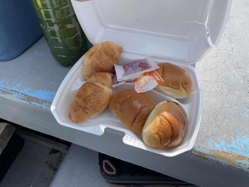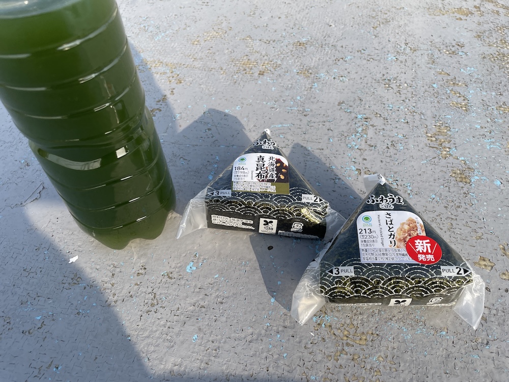 AM8:35 《西沖海上》朝食は「東横インパン」で簡単に済ませました。もう、毎日のルーティンになっています。水筒にコーヒーを入れ、それを飲みながらクロワッサン。文字で書いたら素敵なモーニングですが、揺れる船の上での熱いコーヒーは飲むのも大変でした。※画像なしPM13:40《西沖海上》ホテルで「青汁」粉末で飲み物を作り、コンビニでおにぎりを購入。船上でも観光管理だけは一応気にしてみました。「青汁」好き。
